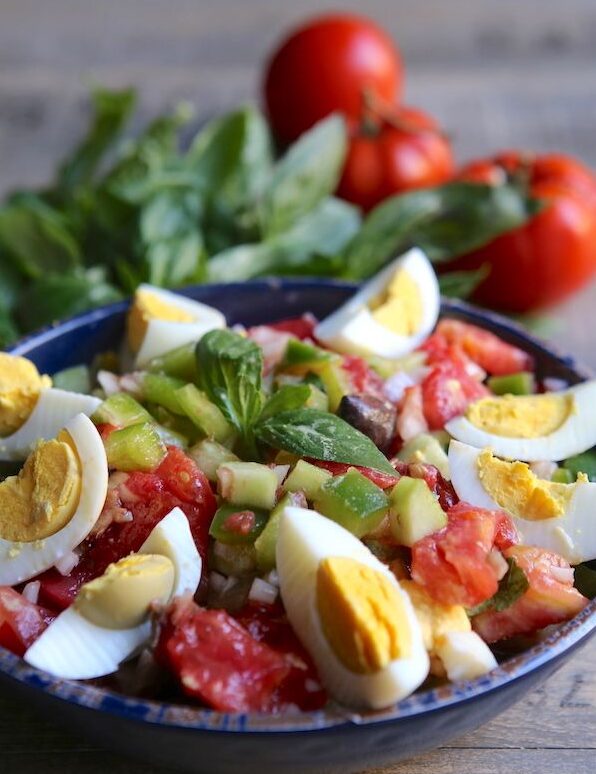 Assaisonnez avec huile d’olive, vinaigre, sel et poivre.